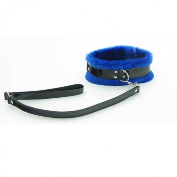 Шикарный ошейник из натуральной лакированный кожи, декорированный мехом королевского синего цвета - это именно то, что необходимо для самой незабываемой сессии!