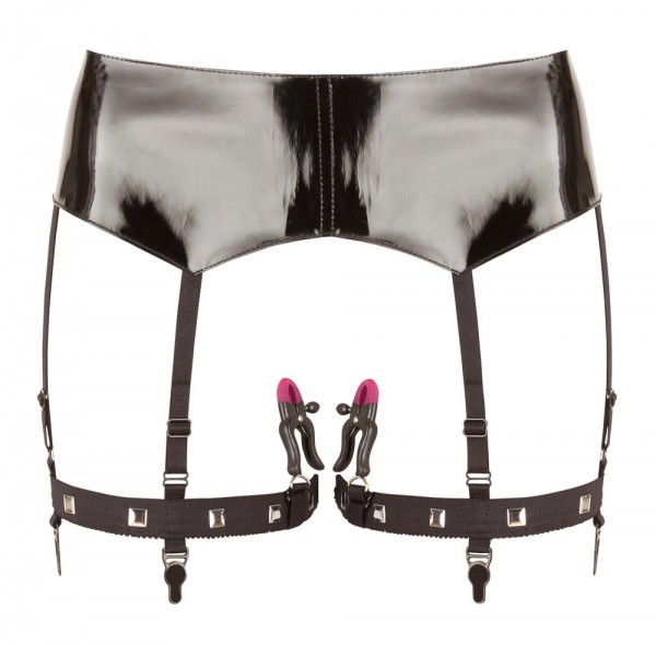 Прелесть пояса заключается не только в том, что он выполнен из настоящего винила, но и в том, что к нему прикреплены подвязки для чулок с пажами, а также зажимы для половых губ!
